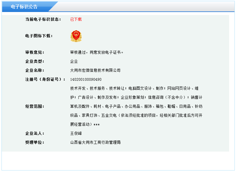 8月30日,宏微信息技術(shù)通過山西省工商行政管理局經(jīng)營性網(wǎng)站認(rèn)證,獲得經(jīng)營性網(wǎng)站“電子標(biāo)識(shí)”,工商紅盾標(biāo)識(shí)號(hào)碼為