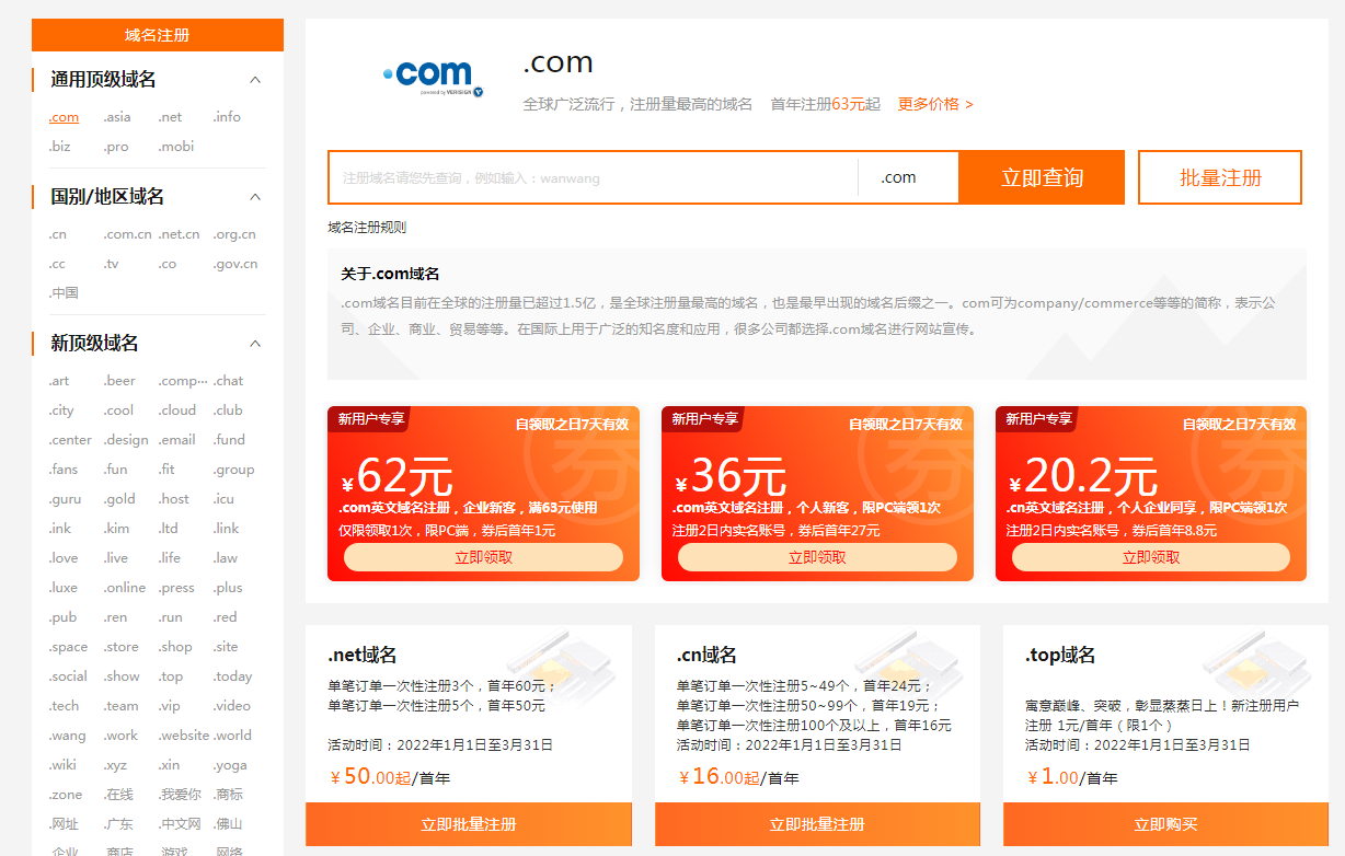 域名(需每年續(xù)費(fèi))  國內(nèi)域名注冊商一共也沒多少家,全國比較知名的就阿里云(以前的萬網(wǎng))、新網(wǎng)這些的,其他小的注冊商幾乎都是這些大公司的代理,域名注冊費(fèi)用每年都在變,但是基本上價(jià)格浮動不是很大。