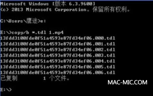 然后使用WIN圖標(biāo)鍵+R ,打開cmd ,輸入 e: 按下回車進入e盤 ,然后輸入:copy/b *.tdl 1.mp4 對E盤下所有tdl格式的文件進行合并。