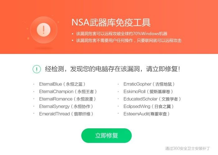 針對NSA黑客武器利用的Windows系統(tǒng)漏洞,微軟在今年3月已發(fā)布補(bǔ)丁修復(fù)。此前360安全中心也已推出“NSA武器庫免疫工具”,能夠一鍵檢測修復(fù)NSA黑客武器攻擊的漏洞;對XP、2003等已經(jīng)停止更新的系統(tǒng),免疫工具可以關(guān)閉漏洞利用的端口,防止電腦被NSA黑客武器植入勒索病毒等惡意程序。