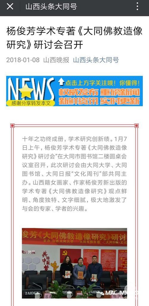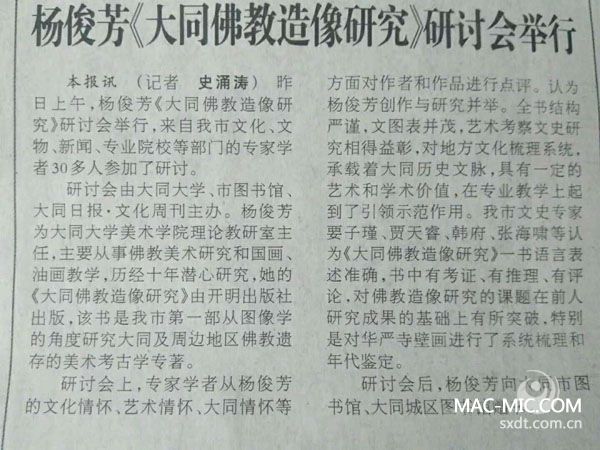 十年之功終成冊(cè),學(xué)術(shù)研究創(chuàng)新績(jī)。2018年1月7日,伴隨著大同入冬以來(lái)的第一場(chǎng)瑞雪,楊俊芳的學(xué)術(shù)專著《大同佛教造像研究》作品研討會(huì)在大同市圖書(shū)館召開(kāi),本次活動(dòng)由大同大學(xué)、大同市圖書(shū)館、大同日?qǐng)?bào)·文化周刊共同主辦。來(lái)自大同大學(xué)、大同市文化界、學(xué)術(shù)界的眾多專家、學(xué)者、作家40余人共聚一堂,就該作品進(jìn)行了研討。新大同網(wǎng)應(yīng)邀參加了本次會(huì)議。
